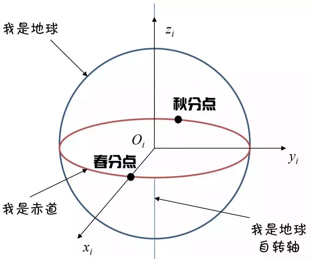地心惯性系:以地球的地心为原点,以地心指向春分点和秋分点的连线为X轴、Y轴,以地球自转轴指向北极为Z轴组成的右手坐标系。因为春分点和秋分点不是地球表面上和地球固定的两个点,而是地球所属宇宙空间中两个固定的点(因为赤道面和黄道面是固定的面)。所以,春分点和秋分点不会因为地球的自转而移动,故地心惯性系是相对静止的,不会随地球自转而移动。