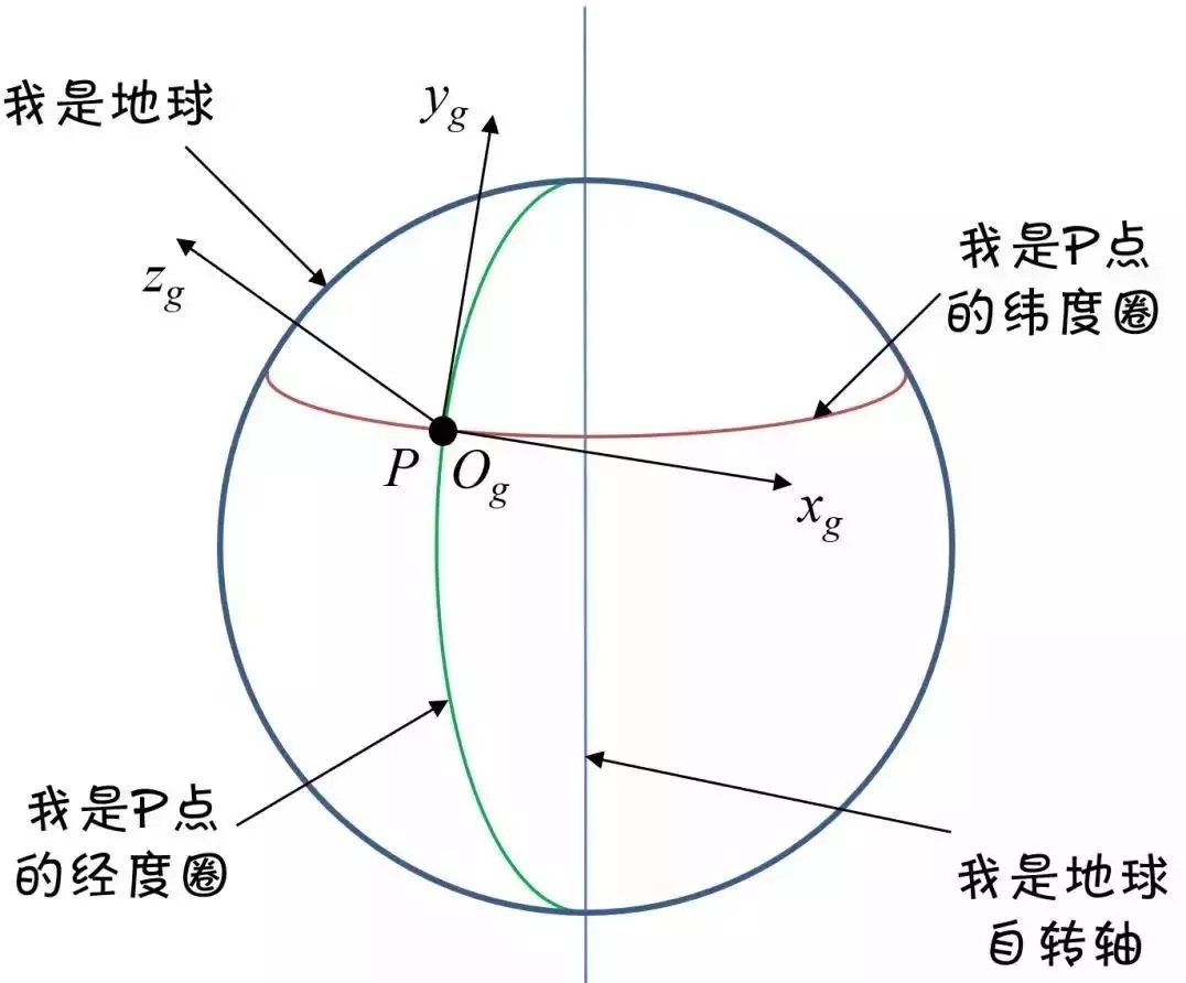 地理坐标系:以运载体(如下图的P)的中心为坐标原点,x 轴指向正东方向,y 轴指向正北方向,z 轴垂直指向天上。地理坐标系会随运载体的移动而移动。