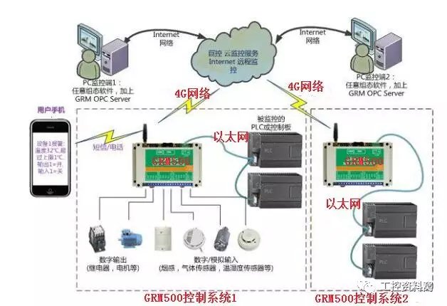 1. 巨控GRM500和PLC通过以太网连接,GRM500通过插入的手机卡4G或者网线或者WIFI上网。 2. 远程电脑只需能上网,即可,不需要固定IP,不需另外的服务器。 3. 远程电脑上需安装OPCSERVER,然后登陆对应模块的序号和密码。 4. 力控组态软件是通过OPC接口从OPCSERVER访问远程的PLC数据。 1. GRM500G一台(插入开通流量的4GSIM卡或者网线或者WIFI)和西门子S7-1200PLC通过网线S7_TCP连接。 2. 可以上网的电脑一台.(无需固定IP,只要求能上网即可)