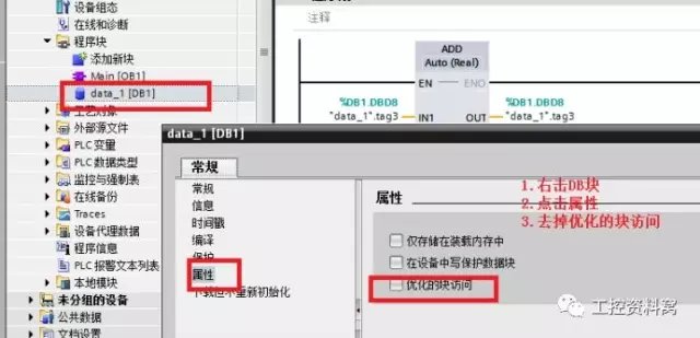 如果程序中有 DB数据块,右击相应的 DB块,选择“属性”,把优化的快访问前面的勾取消掉