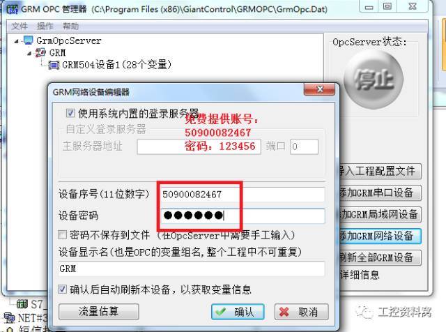 5.在电脑上使用巨控GrmOpcServer软件包中的GRMOPC管理器(GrmOpcMgr.exe),“添加GRM设备”后,并点击“刷新全部GRM设备”。这样GRMOPCSERVER就通过网络获取了模块中定义的需要远程监控的变量!