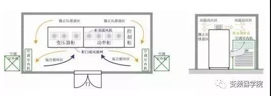 变频器从柜体的正面和后面吸入空气,经柜顶风机将变频器内部的热量带走排到室内。从而在变频器室上部形成一个温度偏高、压力偏高的气旋涡流区,在变频器的正面部分形成一个偏负压区。在运行中,变频器功率柜正面上部区域实际上是吸入刚排出的热风进行冷却,形成气流短路风不能达到有效的冷却效果。空调通常采用下进上出风结构,从而与变频器在一定程度上形成了“抢风”现象,这就是“混合循环区”。在这个区域变频器吸入的空气不完全是空调降温后的冷空气,空调的降温处理也没有把变频器排出的热空气全部降温,从而导致了整个冷却系统的运行效率不高。变频器自身是节能节电设备,而通常采用的空调式冷却则造成能源的二次浪费。这种情况在大功率、超大功率的变频应用系统中更加明显。 二、风道冷却