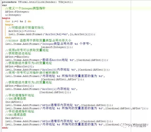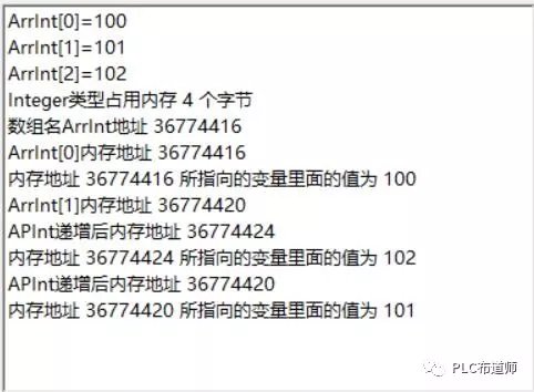 翻了一下手头 1200 PLC的指针内容,发现没多少可讲,但是300,400 ,ET200里面的指针功能还是蛮强大的,但是手头只有1200,所以决定这次抛开PLC ,用高级语言写一段指针代码,让我们深入了解指针。 无论是在PC环境还是PLC环境,指针的含义基本上一样。指针就是代表变量在内存中的位置,就如同你出差住宾馆,门牌房间号代表你在宾馆的位置,警察叔叔可以通过房间号找到你。 何谓内存?普通人大概的印象就是电脑上面的内存条吧,比如有4GB,8GB,16GB,内存越大,电脑速度越快。那内存和硬盘的区别到底是什么呢?从WIKI上面抄了一段话,大家凑合看看。 计算机存储器(英语:Computer memory)是一种利用半导体技术制成的存储数据的电子设备。其电子电路中的数据以二进制方式存储,存储器的每一个存储单元称做记忆元。 计算机存储器可分为内部存储器(简称内存或主存)和外部存储器,其中内存是CPU能直接寻址的存储空间,由半导体器件制成。内存的特点是访问速率快。内存是计算机中的主要部件,它是相对于外存而言的。我们平常使用的程序,如Windows操作系统、打字软件、游戏软件等,一般都是安装在硬盘等外存上的,但仅此是不能使用其功能的,必须把它们调入内存中运行,才能真正使用其功能,我们平时输入一段文字,或玩一个游戏,其实都是在内存中进行的。就好比在一个书房里,存放书籍的书架和书柜相当于计算机的外存,而我们工作的办公桌就是内存。通常我们把要永久保存的、大量的数据存储在外存上,而把一些临时的或少量的数据和程序放在内存上,当然内存的好坏会直接影响计算机的运行速度。 指针程序讲解: 图1 定义一个整型数组 图2 指针定义代码 图3 运行内存 数组里面存储一系列同类型的连续变量,所以获取这些变量的地址,发现地址之间的差值为4 。为什么为4 呢?是因为我们声明的数组类型为Integer ,我们可以看到Integer类型占用的内存字节大小为4 。如果数组类型为Byte ,那么内存地址之间的差值是多少?请读者自行思考。 程序中,我们可以通过APInt这个Integer指针类型,来逐一获取数组中每个索引的内容。可以直接获取数组名来获取地址,也可以通过对指针地址手动偏移进行获取。这就是指针的方便之处,可以在内存里面进行数据操作,可以对任何数据类型进行操作。 在西门子的高级指令里面,很多功能块的输入参数是要求指针类型。为什么是这种类型要求呢?比如一个变量,你只要告诉他是指针就行,然后PLC内部会根据这个变量类型来解析这个内存地址代表的数据。 结束语这一节主要讲解了指针概念,理解了上面的程序,基本上就理解了指针,透过指针可以很方便的操作数据。若有错误和不懂的地方欢迎留言。下一节主要讲解PLC通信概念。