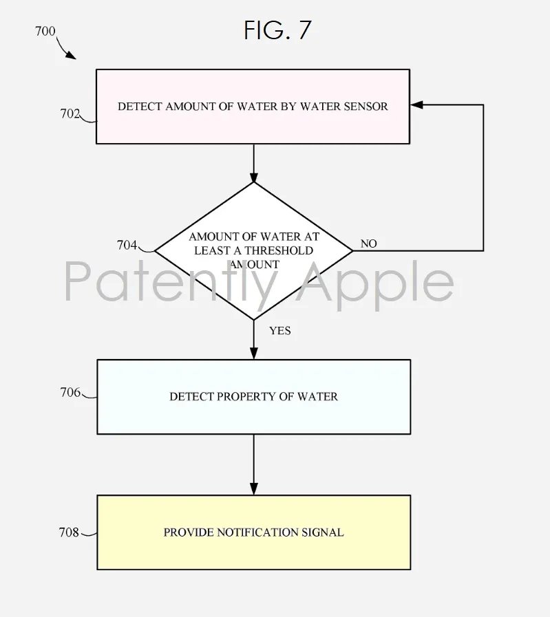 手表还可以具有另一种类型的传感器层,该传感器层可以监视水以进行属性检测。苹果公司特别指出,如果地理位置数据表明水体在湖泊附近,则可以设置生物物质传感器来检测生物物质,例如有害病原体。用于检测有害化学物质的化学传感器会触发用户警报。 苹果继续列出另一轮传感器。他们指出,有一个盐度检测器可用于确定水的盐度,并根据该结果可以确定水是盐水还是淡水。 如果确定水对应于盐水,则地理位置设备可以将当前位置固定为海洋(或湖泊)。该位置还可以通过使用评估的上下文以及以用户物理数据(心跳,呼吸频率等)的形式从用户接收的数据间接确定。 在这种情况下,可以调用某些其他传感器来检测与海洋有关的盐水的特定属性,尤其是与系统所处位置有关的盐水。可以选择其他传感器来确定当前环境相对于用户的健康状况如何良好。 例如,生物物质传感器可用于检测病原体,而pH传感器可用于检测不安全的pH值。而且,诸如化学传感器之类的其他传感器可以用于检测危险化学物质,而微粒传感器可以用于检测微粒。在任何情况下,来自传感器的信息都可以由处理器处理,这可以使通知层发出相关的通知。 下图的FIG.7展示出了流程图,该流程图示出了将Apple Watch用作环境传感器/健康监视器的方法。 来源:Patenly Apple 作者:Jack Purcher