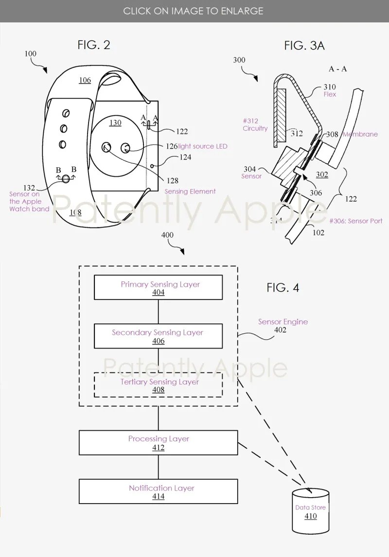 2020年4月14日,美国专利商标局正式为Apple Inc.发布了一系列54项新授予的专利。 苹果新获54项专利 如上图所指出的,Apple获得了一项名为“ 游泳量热法的系统和方法 ”的专利,该专利使Apple Watch可以估算用户游泳时的能量消耗;苹果还获得了覆盖区域扫描光疗设备的专利;此外,Apple还获得了一项可以戴着手套在iPhone上滚动的“手套触摸检测”专利。 覆盖区域扫描光疗设备的专利 苹果获得了名为“区域扫描光疗设备和方法”的10,617,564号专利。但奇怪的是专利的两位发明者不是苹果的工程师,而且标的还很陌生。 专利摘要指出:一种用于治疗病变的系统和方法在目标组织上的图像,包括用于捕获包含病变的目标组织的图像的可视化设备,用于生成光束的光源,用于使光束以治疗图案形式偏转的扫描仪以及用于确定目标边界的控制器从捕获的图像中清除病变,并控制扫描仪将治疗图案投射到目标组织上以及病变的边界内。对准光源可以用于产生对准光束,使得扫描仪使对准光束以对准图案的形式偏转。控制器控制扫描仪以将对准图案投影到目标组织上,以可视地指示治疗图案在目标组织上的位置。 下图的FIG.9展示出了适合于治疗靶组织的系统的组件。 手套触摸检测专利 苹果还获得了名为“手套触摸检测”的专利10,620,758。苹果的专利涉及动态调整用于识别输入的条件,该条件是戴着手套触摸触敏设备。您可以在此处查看该发明的详细信息。 其实此次Apple的专利更专注于传感器,比如专利报告中介绍了可能会在未来的Apple Watch中使用的下一代传感器。 尽管Apple Watch刚刚添加了ECG组件来监视用户的心脏,但Apple正在开发一系列全新的健康传感器,这些传感器将吸引喜欢户外活动的活跃年轻人。更具体地说,Apple的新专利传感器还可以检测与水和水的组成有关的用户环境。例如,Apple Watch可以警告游泳者或浮潜者鲨鱼在附近,并意识到这种危险。 下图中的FIG.2展示了未来的Apple Watch的背面,表带的内部装有传感器。苹果公司指出,传感器#128可用于检测用户皮肤表面的出汗量或出汗量。以这种方式,该传感器可以用于触发其他传感器,这些传感器可以确定例如汗液的pH值,病原体的存在,与疾病有关的化学物质等。 FIG.3则显示了Apple Watch携带的传感器系统#300的代表性剖视图。手表的外壳可以包括开口#122,该开口可以通向空腔#302(或井#302),其容积至少定义了一个阈值水量,表明手表被淹没或以其他方式与大量的水接触。该传感器知道手表在水里与因雨水,草坪洒水等使水滴入之间的区别。这样,可以避免错误的警报或触发。 而FIG.4——Apple的感应系统#400中,则包括有传感器引擎#402,该传感器引擎可以用来触发主感应层#404。而主感应层#404可用于定期监视外部环境中外部环境的特定元素。基于处理层(#412)执行的处理,通知层(#414)可以根据传感器引擎提供的一组预定条件或观察向用户提供通知。通知系统可以与用户可以认为对用户的健康重要或至少相关的环境要素的各个方面有关。通知系统可以基于当前环境条件向用户提供警告和/或提供要采取的其他措施。 例如,通知系统可以警告正在海洋中游泳,浮潜或佩戴水肺潜水的用户该区域存在危险状况(如潮汐)或危险掠食者(如鲨鱼)。