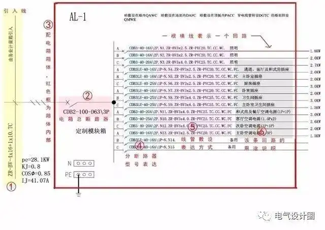 ZR :表示阻燃 3×2.5:3根2.5芯的电缆线 4×25+1×16:是线的平方数 PVC20:用pvc管敷设,管径20mm TC、CC、WC:暗敷方式表达(敷设形式是在顶面、墙面或者穿电线管) CT-SC80-ACC:SC表示水煤气钢管,CT表示电缆桥架敷设,80是指公称直径 既不是外径也不是内径,ACC表示暗敷设在不能进人的吊顶内。 BV:是聚氯乙烯绝缘电线 2*6+E6)表示两根6平方毫米的电源线,加一根6平方毫米的接地保护线 SC20-C :是说明使用DN20的水煤气管做穿线管,暗敷 QAWC:敷设在墙内 DAFC:敷设在地面内 PACC:敷设在顶板内 DGTC:穿电线管敷设 QMWE:沿地面敷设 例如:ZR-BV3×2.5.ZR-PVC20.TC.CC.WC,或者 ZR-YJV-4×25+1×16-CT-SC80-ACC或BV(2*6+E6)SC20-C。 例如:CBD3LE-40-16A、CBD3LE-C16A,“CBD3LE”为断路器的型号,“C”为C型脱扣曲线,保护电路用,”40-16A”为额定电流大小。 二、配电系统图中各种参数的含义解析