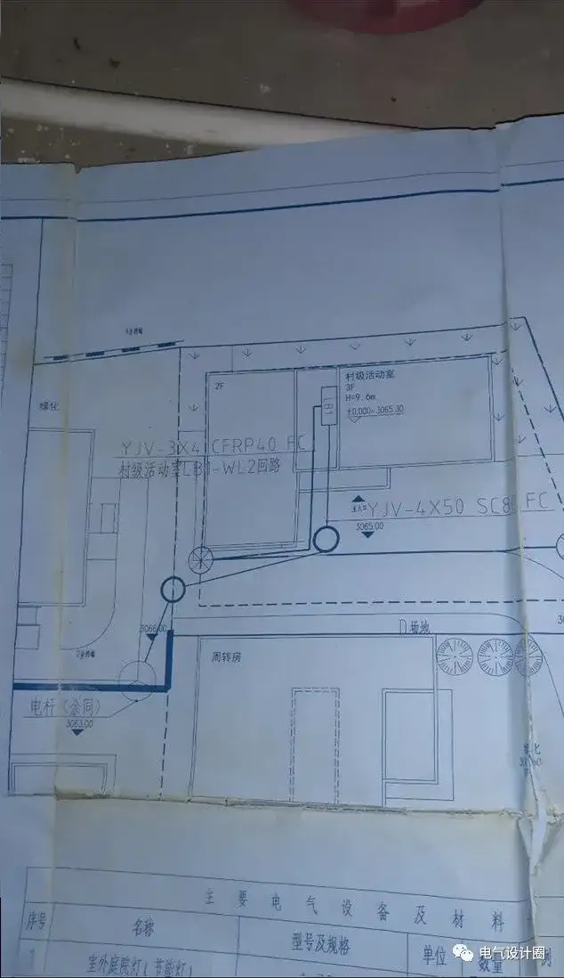 (局部电气系统图) 如上图:村级活动室的总配箱LB1的进线电源,由电线杆下杆线引来,经过两个手井孔(电缆检查井),穿SC80的焊接钢管埋地进入。