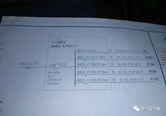 看看分箱HE配置。 HE箱共有五个回路N1~N5,照明回路HKKC2-63 C16A/1P 表示为塑壳式小型断路器,1P即1极,只接一根火线,C16A表示普通家用断路器,额定电流16A,不带漏电。BV-3x2.5FPC20 WC CC表示3根2.5平方电线,穿20阻燃线管,沿墙面、顶面暗敷设。如上图。 HKKC2L-63 D20A/2P 30mA为动力型回路开关,即空调插座回路。其余回路同理。如下图: