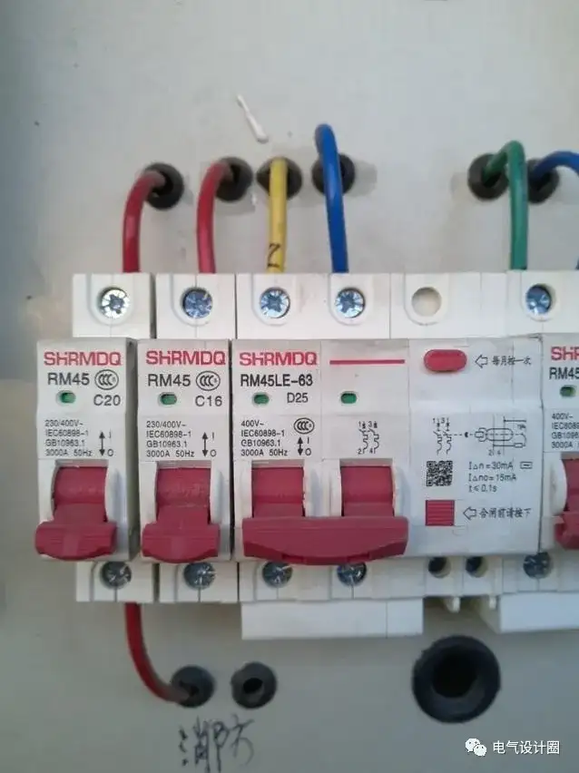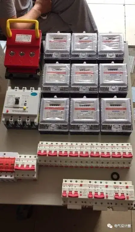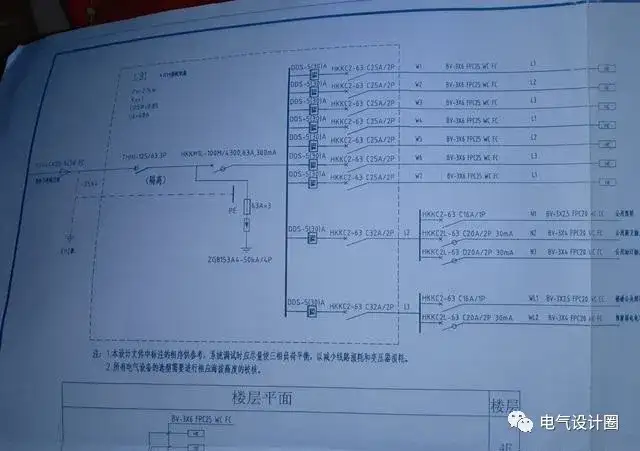 出线到各分箱HE为3x6平方电线,经单相电能表后再经25A的2P小型断路器到楼层分箱。如下图: