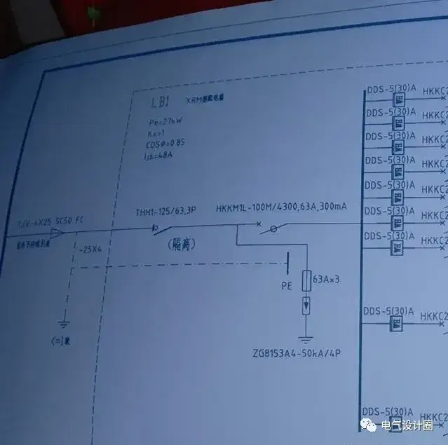 总箱LB1为:XRM型配电箱,即嵌入型,设计要求为嵌墙暗装。箱体大小设计没说明,实际做出来为:800x1000mm,安装高度为底边距地1.6米。 进线:YJV——4x25 SC50 FC表示:进线为25平方毫米的4芯交联聚氯乙烯电缆,穿50焊接钢管,埋地引入。即3根相线,1根零线,不带接地线,所以我们需另做接地,25ⅹ4的接地扁铁, 进线接线端与总开之间加刀闸式隔离开关,厂家改成了刀闸式熔断开关。