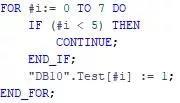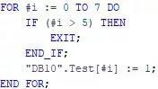 如果满足条件 i < 5,则不执行后续值分配 ("DB10".Test := 1)。运行变量 (i) 以增量"1"递增,然后检查其当前值是否在设定的循环取值范围内。如果执行变量在循环取值范围内,则将再次计算 IF 的条件。