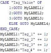 根据"Tag_Value"操作数的值,程序将从对应的跳转标签标识点开始继续执行。例如,如果"Tag_Value"操作数的值为 2,则程序将从跳转标签"MyLABEL2"开始继续执行。在这种情况下,将跳过"MyLABEL1"跳转标签所标识的程序行。