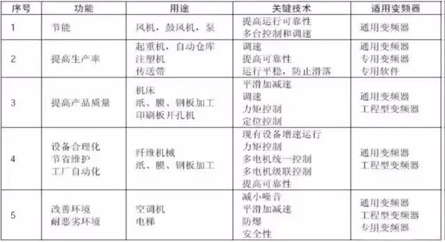 变频器和交流电机构成的可调速传动称为变频器传动,其功能用途如下。其中可能互为关联,实际上无明确分类,此表仅作参考。