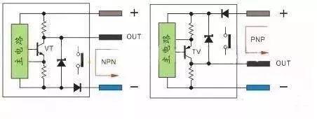 (3)S/S端子接法参考图5-图6以及图11-图12。 3、有源三线传感器(电感接近开关、电容接近开关、霍尔接近开关、光电开关等)直流有源三制线接近开关与光电开关输出管使用三极管输出,因此传感器分NPN和PNP输出,有的产品是四线制,有双NPN或双PNP,只是状态刚好相反,也有NPN和PNP结合的四线输出。 NPN型当传感器有检测信号VT导通,输出端OUT的电流流向负极,输出端OUT电位接近负极,通常说的高电平翻转成低电平。 PNP型当传感器有检测信号VT导通,正极的电流流向输出端OUT,输出端OUT电位接近正极,通常说的低电平翻转成高电平。 电路中三极管的发射极上的电阻为短路保护采样电阻2-3Ω不影响输出电流。三极管的集电极的电阻为上拉与下拉电阻,提供输出电位,方便电平接口的电路,另一种输出的三极管集电极开路输出不接上拉与下拉电阻。 简单说当三极管VT导通,相当于一个接点导通,如图13: