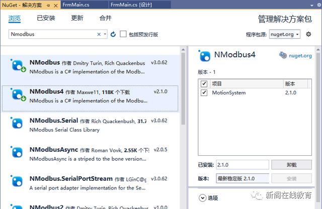 - 自己开发ModbusTCP通信库或者使用开源库,该库应该具备建立连接、断开连接、预置寄存器、读取寄存器的功能。这里采用开源Modbus通信库NModbus4,通过NuGet下载安装NModbus通信库。