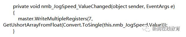 - 参数设置:需要设置的参数包括点动速度、相对速度、相对距离、绝对速度、绝对位置,这里通过将设定的浮点数转换成ushort数组,再通过调用WriteMultipleRegisters实现,以点动速度设置为例,代码如下所示: