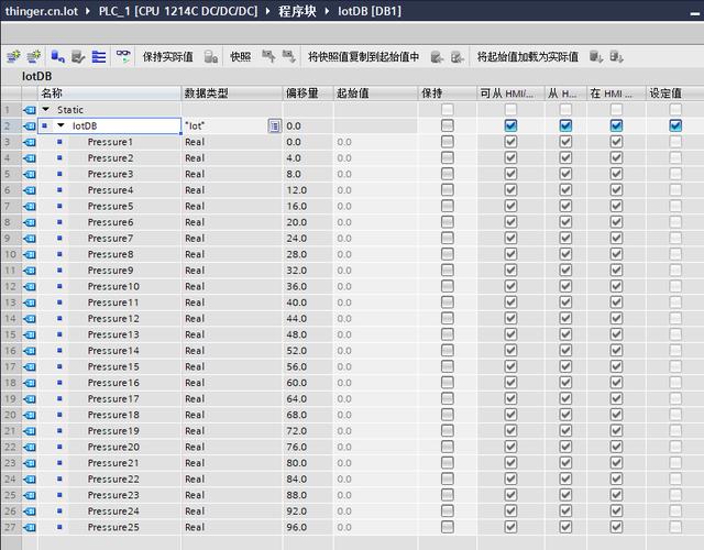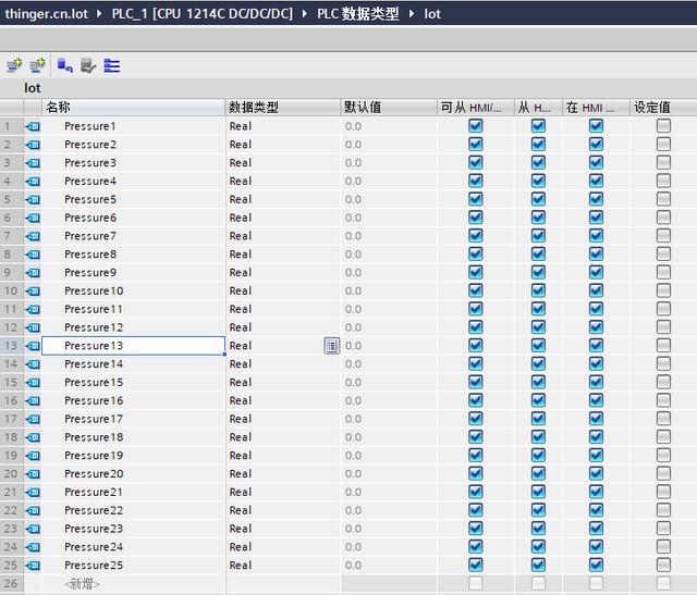2、Iot传输实现- 首先在PLC中准备好需要传输的数据,最好提前都数据到放到同一个存储区中,并且是连续的N个字节,这里以一个结构体为例,里面包含25个浮点数,占100个字节,如下图所示:
