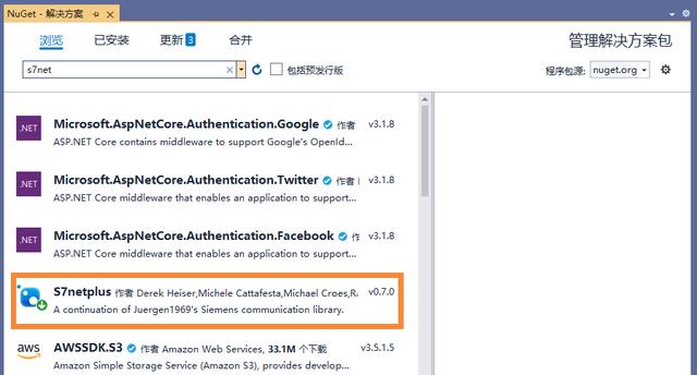 - 首先在Nuget服务器中搜索S7netplus,添加到项目中,如下图所示: