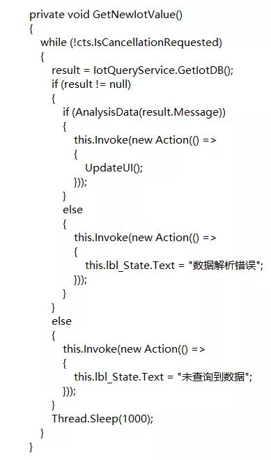 - 这里采用多线程的方式,持续从数据库中进行数据查询,如果查询到数据,进行解析赋值,否则进行状态显示,代码如下所示: