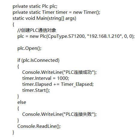 - 添加完成之后,初始化PLC对象,然后连接PLC,连接成功后,开启一个定时器,编写程序如下所示: