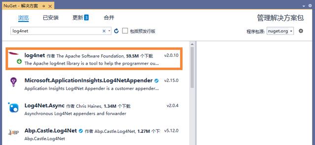 - 接着搜索log4net,添加到项目中,如下图所示: