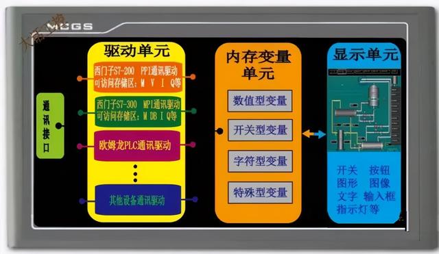 触摸屏的内部大致可以分为:通讯接口单元,驱动单元,内存变量单元,显示单元。除了显示单元,其他3个单元在触摸屏的内部我们是看不见的。 1、通讯接口单元:这个单元主要负责把驱动单元打包好的数据包,发送到触摸屏背面的通讯接口,再由通讯接口发送给PLC,这些过程我们是不用干预的,触摸屏会自己完成。我们要做的就是,选择一个驱动单元里的驱动,说白了就是告诉触摸屏它要发送哪个驱动数据包。 2、驱动单元:这一单元里存放了许多和PLC连接的通讯文件,一个文件对应一种通讯协议(对通讯协议不懂的也看我以前文章),我们把这些文件叫做驱动。也就是说一个驱动对应一种通讯协议,比如说西门子S7-200PLC使用PPI通讯协议,那么触摸屏厂家就会编写一个能和西门子S7-200PLC PPI通讯协议,通讯的文件,然后放在驱动单元。 举例,比如当我们的触摸屏想要和西门子200的PLC连接时,我们就在触摸屏里选择PPI驱动。想要和西门子300的PLC连接,选择MPI(MPI是西门子300PLC的通讯协议)驱动就可以了。这些驱动文件都是触摸屏厂家提前写好的,我们只能选择不能更改。可见触摸屏里面的驱动越多,我们可以选择的PLC品牌或通讯协议的范围就越广。现在成熟的触摸屏厂家内置的驱动,基本都能覆盖市面上常用的PLC和通讯协议。 所以当我们手上有一款触摸屏,想要选择一个PLC做通讯时,一定要看看你的触摸屏里有没有,可以和这个PLC通讯的驱动。 3,内存变量单元:这一单元也是触摸屏厂家内置的,它实际上就是一块存储区,它里面可以存放各种各样的数据,存放的数据类型大致可以分为数值型,开关型,字符型,特殊型。 比如我们想要在触摸屏上显示一个锅炉的水温,那么我们就在触摸屏的内存变量单元,新建一个变量,这个变量的名字叫"锅炉水温"(名字随便取),数据类型选择数值型。那么触摸屏就会自动在内存单元,分配一小块区域给"锅炉水温"这个变量。当触摸屏和PLC通讯时,就会把从PLC读到水温数据存放到这一小块区域,也就是"锅炉水温"这个变量。当我们需要显示多个数据时,只要新建多个变量就可以了。看到这里你可能还是有点不太理解,没关系,等一会我按照下面的图4系统的说一下你就明白了。 4、显示单元:这个单元就好理解了,只要是我们在触摸屏画面上能看到的东西都是在显示单元。就依上面的"锅炉水温"为例,我们想要显示锅炉的水的温度,只要在触摸屏的显示单元上,画一个显示框的部件(这个部件每个触摸屏都有,直接拖到画面就行),然后把这个部件和上面新建的"锅炉水温"这个变量连接起来就行了。