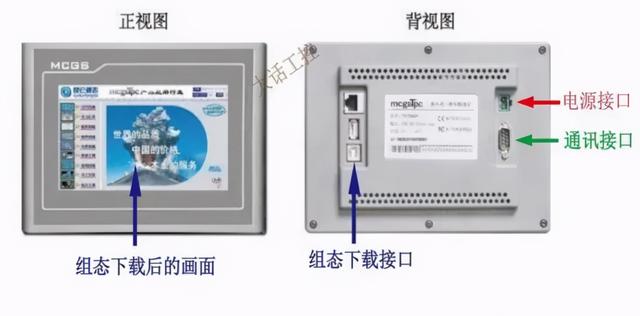 那触摸屏和PLC通讯的原理是什么样的呢?看下面的图2,这是一个真实的触摸屏的正面和背面,正面不用说了,就是显示面。主要看一下背面,有3个接口。