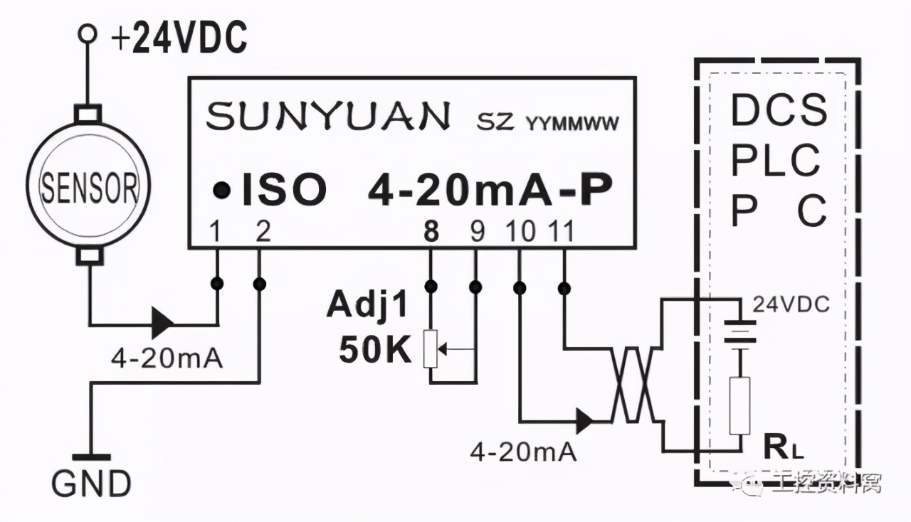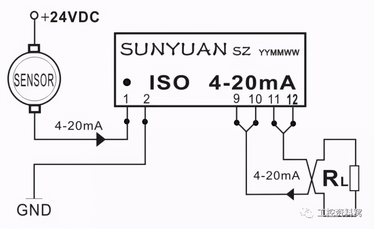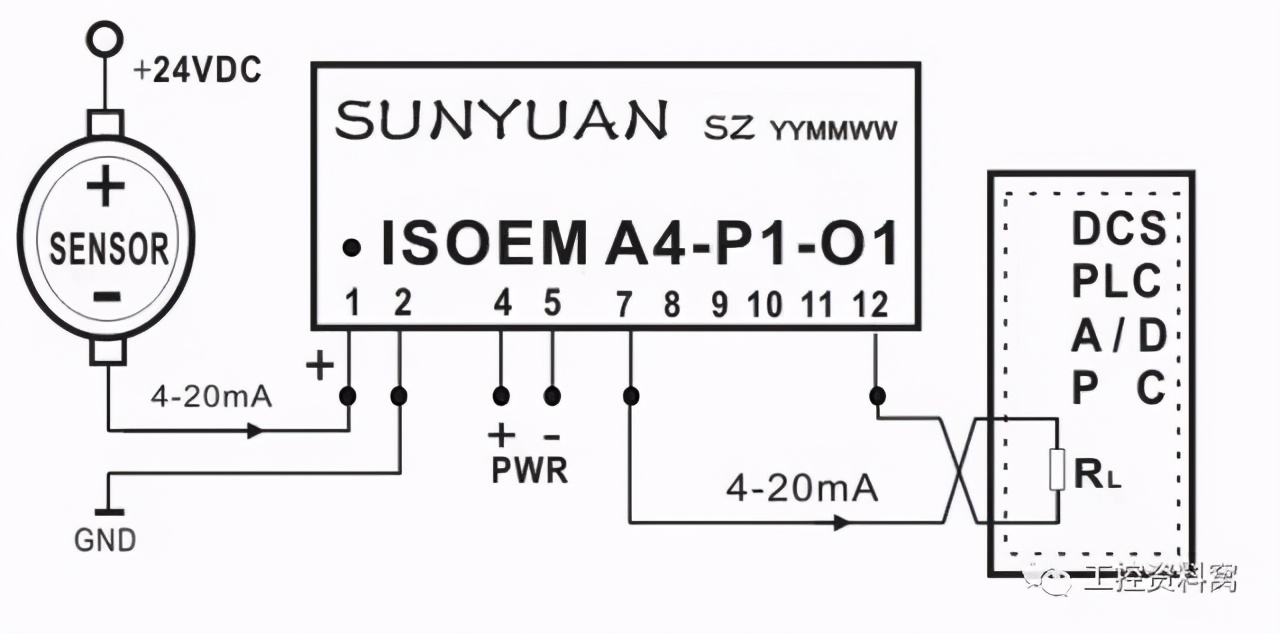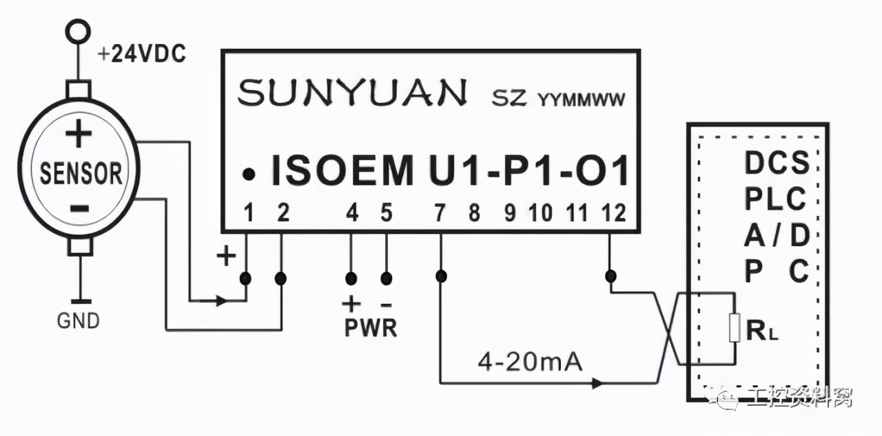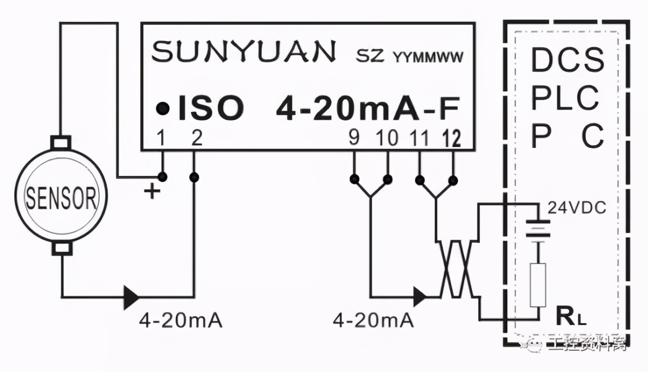 [size=0.8]1.4 两线制传感器输出4-20mA电流经隔离调理匹配(解决输入输出间冲突)后与PLC连接。如图7所示,温度、转速传感器正端接12—24VDC,负端输出4-20mA电流。