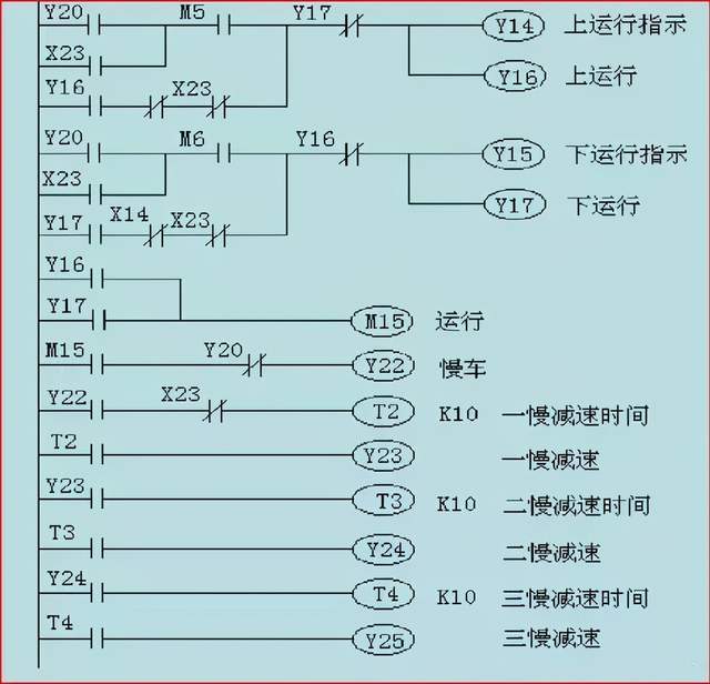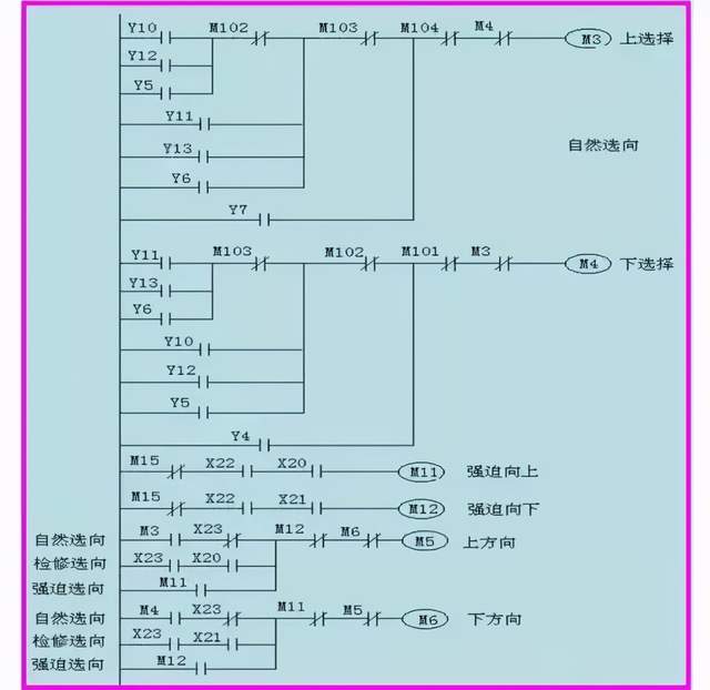 选向回路的作用,是根据目前电梯的位置和指令、召唤的情况,决定电梯的运行方向,是向上或是向下。 电梯方向的选择,实际就是将指令和召唤的位置与电梯实际位置相比较,若前者在上(位置的上下)电梯则选择向上,相反则选择向下。 方向的实现:首先由层楼继电器形成选向链,然后将每层的指令和召唤对应接入。 实际决定电梯的运行方向有以下三种情况。 a.自然选向 如上分析,电梯自己判断来选择方向。 b.强迫选向 若电梯工作在司机方式,可通过操纵箱上的向上或向下按钮,来干预电梯的运行方向,即强迫使其向上或向下。 c.检修选向 若电梯工作在检修方式,同样可使用向上或向下按钮,使电梯以检修的速度向上或向下运行。 电梯的选向回路梯形图如图所示