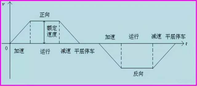 3. 选层电路 选层意味着要减速(换速)准备平层停车。电梯的选层分指令选层和召唤选层,即因某层有召唤或有该层的指令使电梯在该层是否停车。其中指令选层是绝对的,若电梯运行正常,指令一定能使电梯在该层减速停车。 召唤选层是有条件的,一是召唤选层必须满足同向,即与电梯的运行方向一致,这就是所谓的“顺向截车”;二是直驶时可将召唤屏蔽,即电梯直驶时,即使同向的召唤也不能使电梯减速停车。 4. 电梯的运行线路 运行线路是电梯控制系统的核心。电梯是由曳引电动机拖动(主回路),主回路的工作受运行线路的控制,以形成如图所示的速度曲线,决定电梯何时启动加速,何时运行,何时减速,何时平层停车。所以电梯的主要性能指标(额定速度、舒适感、平层精度等)由运行线路决定。