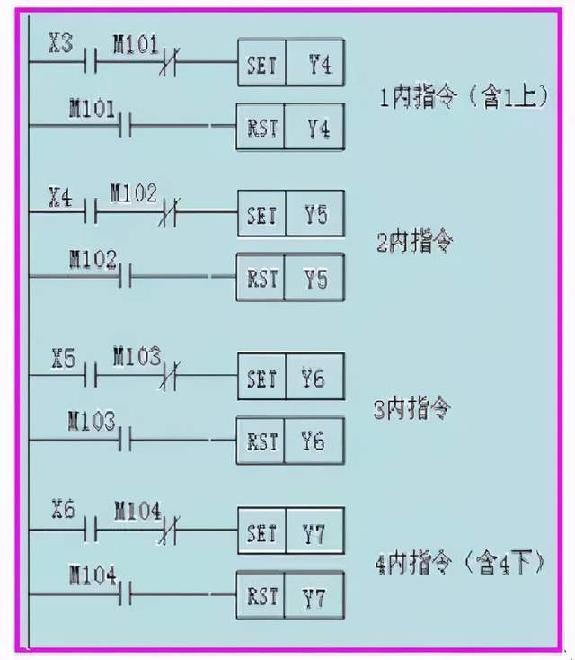 2. 指令和召唤回路 指令和召唤回路的作用是:将轿内指令和厅外召唤信号记忆并指示,当电梯响应后自动将 其消除。 记忆和消除可用PLC的SET和RST指令实现。 (1)指令回路 指令回路梯形图如图所示