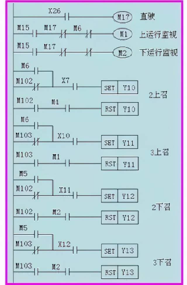 (2)召唤回路 由于除两个端站外,其它各层均有两个召唤(上召、下召),而且召唤的响应是顺向响应。 另外若电梯在直驶运行时不响应召唤,此时召唤应保留。所以召唤回路与电梯的运行方向以及是否直驶密切相关,为此在召唤回路中加入了反映直驶和方向监视的继电器M1和M2。