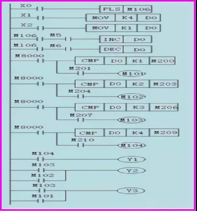 三.控制系统各环节的作用及实现 要对电梯进行控制,首要的问题就是反映电梯实际所在的位置(楼层)。 层楼继电器回路就是完成这一功能的。每一层对应一个层楼继电器,电梯在哪一层,对应楼层的层楼继电器就会动作。 PLC具有数据传送、算术计算、数据比较处理等功能,所以用PLC很容易能实现层楼电路: 启用一数据寄存器D0,电梯在最下层端站时可将1送入D0,最上层端站时,将最高层数送入D0;电梯每上升一层将D0自动加1; 电梯每下降一层D0自动减1,这样使D0中存放的始终是层数; 然后,将D0分别与1、2、3、……相比较,等于几就说明电梯在几,这时驱动对应的层楼继电器,实现层楼电路。 四层四站的层楼继电器电路梯形图如图所示。
