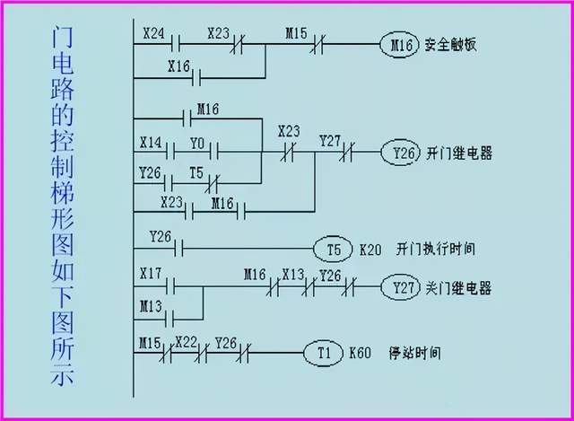 门电路是电梯控制系统中较为独立的单元。它的作用是实现电梯门的开和关。 门电路和控制系统的联系就在于这一点,由各厅门和轿门的门锁电气限位开关的常开触电串联后,作为门锁信号(X13)。X13为ON,表示全部门安全关闭,可正常运行,否则不能运行。开、关门由门电动机驱动,通过开、关门继电器KMJ、GMJ控制M的正反转实现。因此,设计门的控制时只需考虑开与关门的情况,对应驱动KMJ或GMJ (1)开门情况 上班开门、按钮开门、触板开门和门区提前开门。 (2)关门情况 下班关门、按钮开门、停站自动延时关门和强迫向上(向下)启动关门。