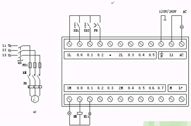 图1 电动机全压起动电气控制线路 图2是采用SIEMENS的一款S7系列PLC实现电动机全压起动控制的外部接线图。主电路保持不变,热继电器常闭触头FR、停止按钮SB2、起动按钮 SB1等作为PLC的输入设备接在PLC的输入接口上,而交流接触器KM线圈、指示灯HL1、HL2等作为PLC的输出设备接在PLC的输出接口上。按制逻辑通过执行按照电动机全压控制要求编写并存入程序存储器内的用户程序实现。