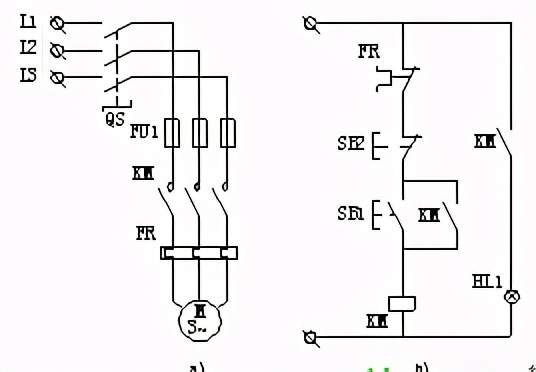 合上QS后按下起动按钮SB1,则线圈KM通电并自锁,接通指示灯HL1所在支路的辅助触头KM及主电路中的主触头, HL1亮、电动机M起动;按下停止按钮SB2,则线圈KM断电,指示灯HL1灭,M停转。