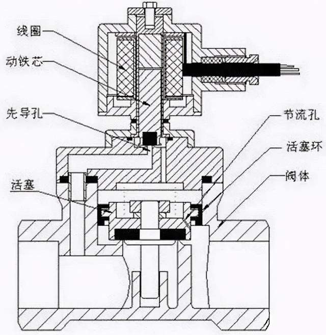 原理:通电时,电磁力把先导孔打开,上腔室压力迅速下降,在敞开件周围形成上低下高的压差,流体压力推动敞开件向上移动,阀门打开;断电时,弹簧力把先导孔敞开,入口压力通过旁通孔迅速腔室在关阀件周围形成下低上高的压差,流体压力推动敞开件向下移动,敞开阀门。 特点:体积小,功率低,流体压力范围上限较高,可任意安装(需定制)但必须满足流体压差条件