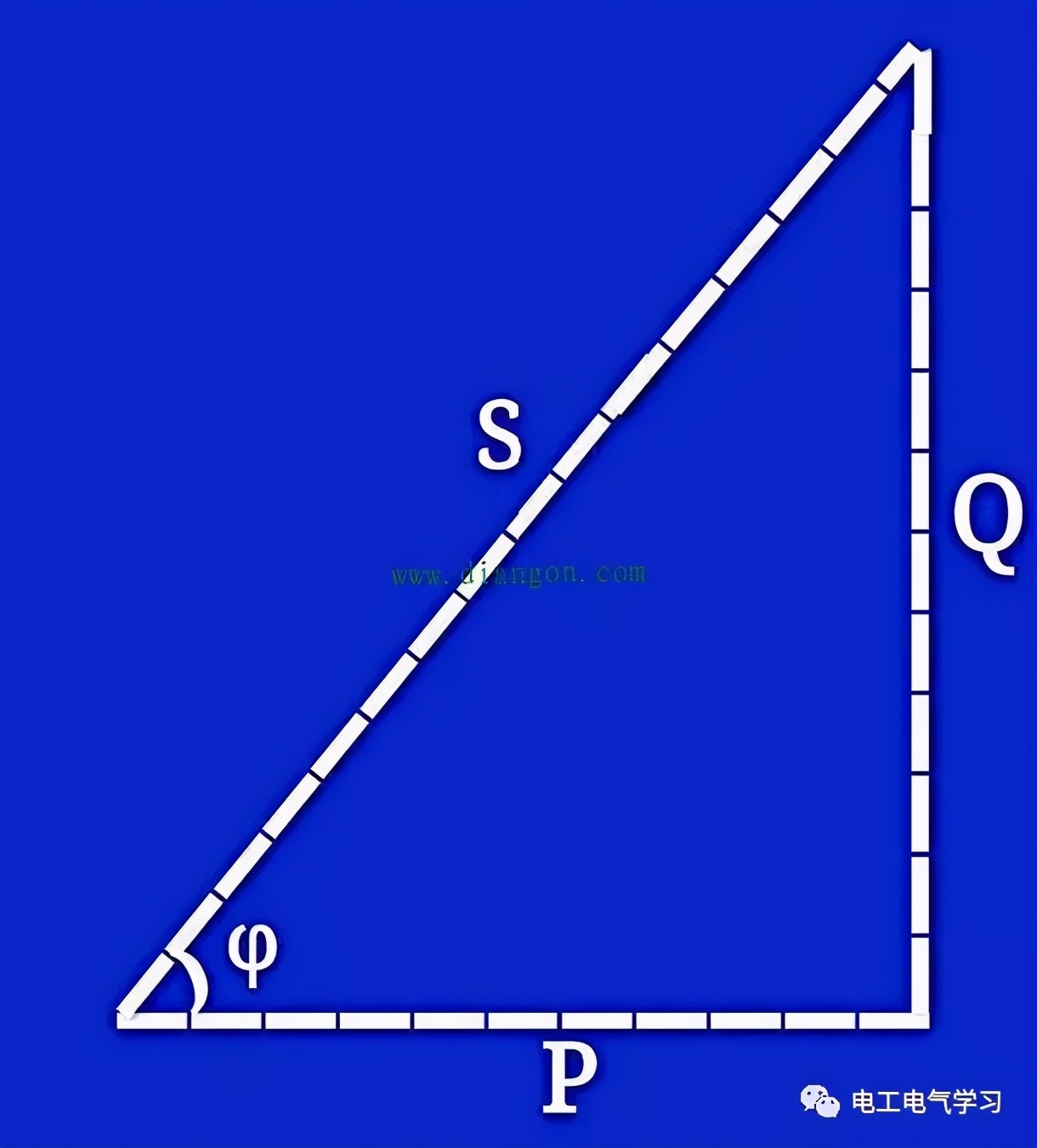 而在实际上是不可能的,只有假设系统中的负荷,全部为电阻性才有这种可能。电路中的大多数用电负荷设备的性质都为电感性,这就造成系统总电流滞后电压,使得在功率因数三角形中,无功Q边加大,则功率因数降低,供电设备的效率下降。见下图所示。