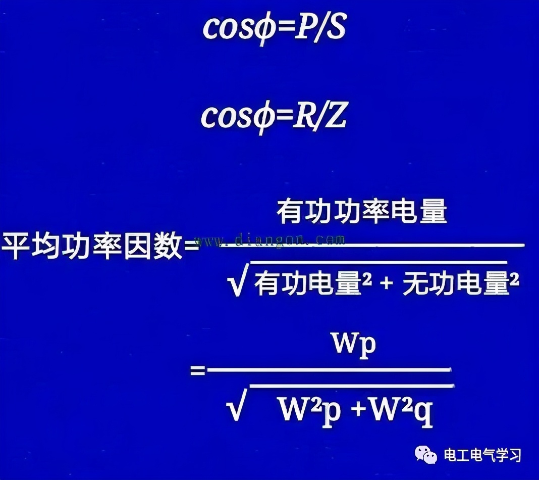 ●功率因数指在交流电路中,电压与电流之间的相位差φ的余弦,用希腊字母cosφ表示。换一种通俗解释即;功率因数是有功功率与无功功率之比,称为功率因数;cosφ=P/S。常用的计算公式请看下图所示