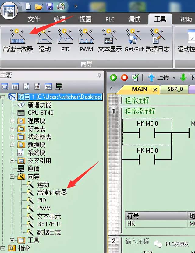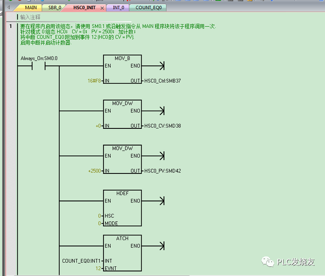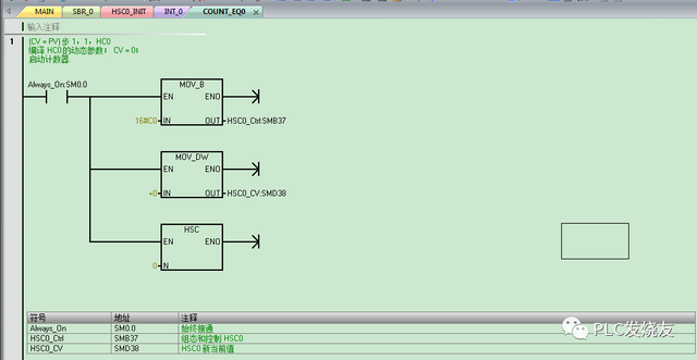 HSC_INIT 为初始化子程序,请在主程序块中使用 SM0.1 或一条边沿触发指令调用一次此子程序。 向导生成的中断服务程序及子程序都未上锁,用户可以根据自己的控制需要进行修改。 通过向导实现高速计数器程序: