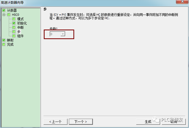 如图 6所示,一个高速计数器最多可以有 3 个中断事件,在白色方框中填写中断服务程序名称或者使用默认名称: 在这里配置的中断事件并非必须,系由用户根据自己的控制工艺要求选用。 1.外部复位输入有效值时中断,如果使用的高速计数器模式不具有外部复位端,则此项为虚。 2.方向控制输入状态改变时的中断,有以下 3 种情况会产生该中断: 单项计数器的内部或外部方向控制位改变瞬间 双相计数器增、减时钟交替的瞬间 A/B相脉冲相对相位(超前或滞后)改变时瞬间 3.当前值等于预置值时产生的中断,通过向导,可以在该中断的服务程序中重新设置高速计数器的参数,如预置值、当前值。一个这样的过程称为‘一步‘。 7. 配置 HSC 步数