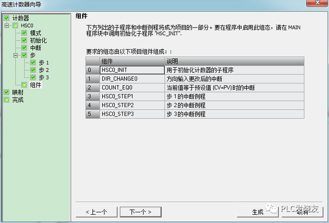 点击向导对话框左侧树形目录中的选项“组件(Components)”可以看到此时向导生成的子程序和中断程序名称及描述,点击“生成(Generate)”按钮,完成向导。 调用子程序