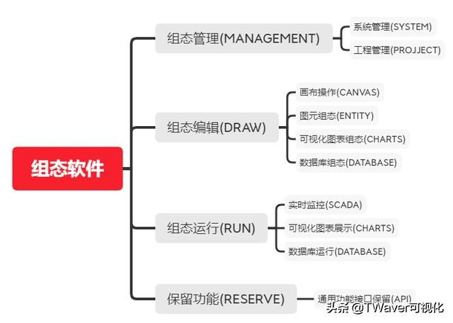 软件主要功能模块有组态管理、组态编辑、组态运行三大模块:  组态软件的功能模块展示