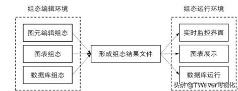 上篇文章《TWaver工业可视化(下)》中提及了可视化编辑器,用户可以在编辑器上直接搭建一个应用系统出来。而本文将提到的WEB组态可视化软件(下称“组态软件”),编辑器只是其中一个功能模块。作为一个独立的产品,组态软件具体指什么?除了编辑器,还有哪些功能模块?又能够运用在哪些场景中呢?下面,将对组态软件进行详细的介绍。 什么是组态?组态(Configure)的概念来自于20世纪70年代中期出现的第一代集散控制系统(Distributed Control System),可以理解为“配置”、“设定”、“设置”等,是指通过人机开发界面,用类似“搭积木”的简单方式来搭建软件功能,而不需要编写计算机程序。我们也可称之为“二次开发”,组态软件即为“二次开发平台”。 组态软件是个怎样的产品?先对产品做一个概述:组态软件通过浏览器操作组态工具、浏览组态画面,实现工程管理、组态编辑以及组态运行三大功能。通过实现图元组态、可视化图表组态、数据库组态的配置与关联,完成基于Web服务的实时数据监控与服务端的多用户访问等。 从用户操作与界面呈现的角度来说,组态软件采用标准HTML5技术,基于B/S架构进行开发,支持WEB端呈现,支持在浏览器端完成便捷的人机交互,简单的拖拽即可完成可视化页面的编排设计。此外,由于组态软件功能较为复杂,配置起来相对复杂,为降低使用门槛,组态软件进行了模块集成化,旨在简化用户的操作步骤,提高用户的工作效率。 从软件架构来说,组态软件具备高度的开放性。随着应用场景的逐渐扩展,软件必然需要进行功能扩展,因此,组态软件不仅支持多种数据接口,更是提供了二次开发接口,可以由用户自行完成二次开发。本质上,组态软件在功能上集成了大量通用模块和个性化模块,以实现不同行业用户的需求。当然,针对具体的用户,软件支持定制化模块的开发与配置,实现“即插即用“。 软件的运行逻辑并不复杂,除了基础的工程管理外,主要可分为组态编辑和组态运行两个部分。用户需要在组态编辑环境中使用组态软件提供的组态功能(图元、图表、数据库)进行组态设置、建立网络拓扑、绘制数据显示界面、配置各种系统参数(如数据采集频率)等;然后在组态运行环境中运行已经组态好的应用系统,包括数据实时监控、场景展示等。两者之间的关系如图所示。  组态编辑与组态运行之间的关系