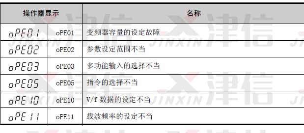 对策∶检出轻故障、警告后,请排除故障原因。排除故障原因后,变频器会自动回到原来的状态。 3、操作故障 在参数输入错误、参数间的组合不正确以及通信选购件的连接不当时出现的故障显示。检出操作故障时,会出现以下状况。 - LED 操作器上表示故障内容的文字点亮。