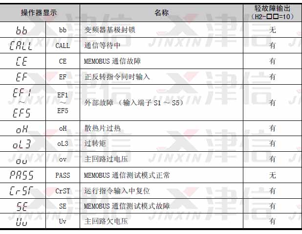 - 轻故障时∶进行多功能接点输出H2-01=10 (轻故障)的设定时,信号关闭。