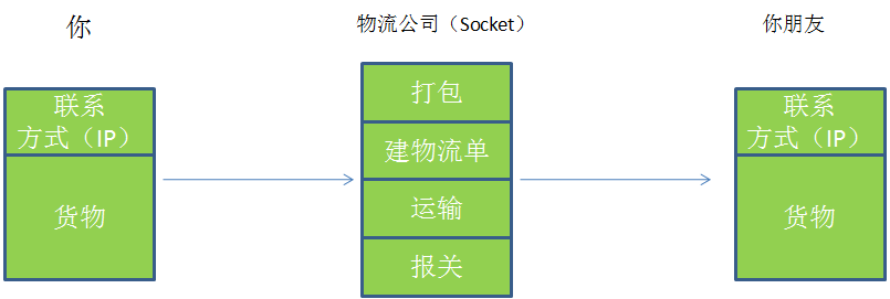 理解Socket好,了解了基本分层机构后,我们现在来形象的理解一下Socket到底是什么。我这里有一个很形象的实例可以帮助我们很好的理解Socket,这也是我当初在学习Socket编程时自己领悟出来的,那就是物流。 我们要传送的数据就是物流中的货物,ip就是发货人和收货人的联系方式,那么Socket是什么?大家想想这送货这这一流程还缺少啥?对呀,物流公司啊,对吧!物流公司就是那个Socket,他负责帮你处理送货的琐碎事情,比如你的货物该怎么打包、该怎么防止易碎物品破碎、该用什么方式运输、等等,如果是境外货物还牵涉到报关等等一系列复杂琐碎的事情,这些物流公司(Socket)帮你处理好了。示意图如下: