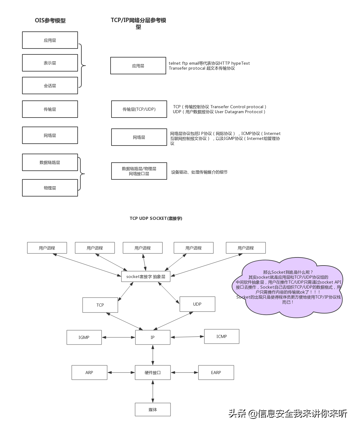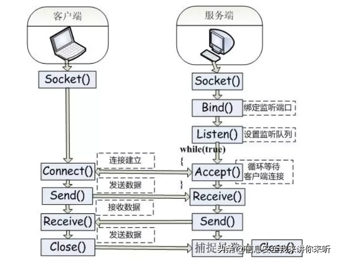 来源:安界(头条)大家都是知道在黑客网络攻防中,熟悉网络通信原理很重要,之前我也写过相关文章,只要了解通信过程,就可以利用过程中存在的漏洞进行攻防,那么在实现攻防的时候,作为一名黑客一定要学会网络编程,而网络编程中很重要的一个环节就是"Socket"的学习和使用! 今天就以本篇文章内容给小伙伴们详细阐述一下"Socket技术原理与实现"。 一、 什么是"Socket"在网络中,根据IP我们可以识别具体的主机,再根据tcp协议+端口我们就可以识别具体主机通讯的进程了;那么socket在其中扮演者什么样的角色呢? 我们经常把socket定义为套接字,socket是在应用层和传输层之间的一个抽象层,它把TCP/IP层复杂的操作抽象为几个简单的接口供应用层调用已实现进程在网络中通信。 下面是网络分层以及socket在分层中的实际位置: