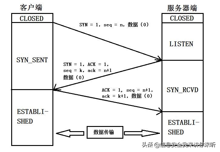 我们可以发现socket就在应用程序的传输层和应用层之间,设计了一个socket抽象层,传输层的底一层的服务提供给socket抽象层,socket抽象层再提供给应用层,问题又来了,应用层和socket抽象层之间和传输层,网络层之间如何通讯的呢,要想理解socket编程怎么通过socket关键词实现和客户端通讯,必须得实现的了解tcp/ip是怎么通讯的,在这个的基础上在去理解socket的握手通讯 在tcp/ip协议中,tcp通过三次握手建立起一个tcp的链接,大致如下 第一次握手:客户端尝试连接服务器,向服务器发送syn包,syn=j,客户端进入SYN_SEND状态等待服务器确认 第二次握手:服务器接收客户端syn包并确认(ack=j+1),同时向客户端发送一个SYN包(syn=k),即SYN+ACK包,此时服务器进入SYN_RECV状态 第三次握手:客户端收到服务器的SYN+ACK包,向服务器发送确认包ACK(ack=k+1),此包发送完毕,客户端和服务器进入ESTABLISHED状态,完成三次握手 三次握手如下图