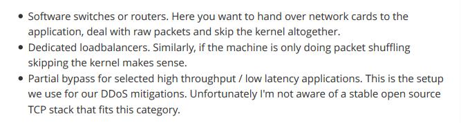 不管是发送路径还是接收路径,系统存在大量内存拷贝,直接影响了TCP/IP协议栈性能,可以利用TCP offload功能,NIC直接拷贝到应用的buffer中去,减少拷贝次数,从而提升性能。 TCP offload可能是未来的趋势,部署方便,代价小,是非常值得关注的一个方向。 5、用户态TCP协议 用户态的协议栈在下列场合比较有用: